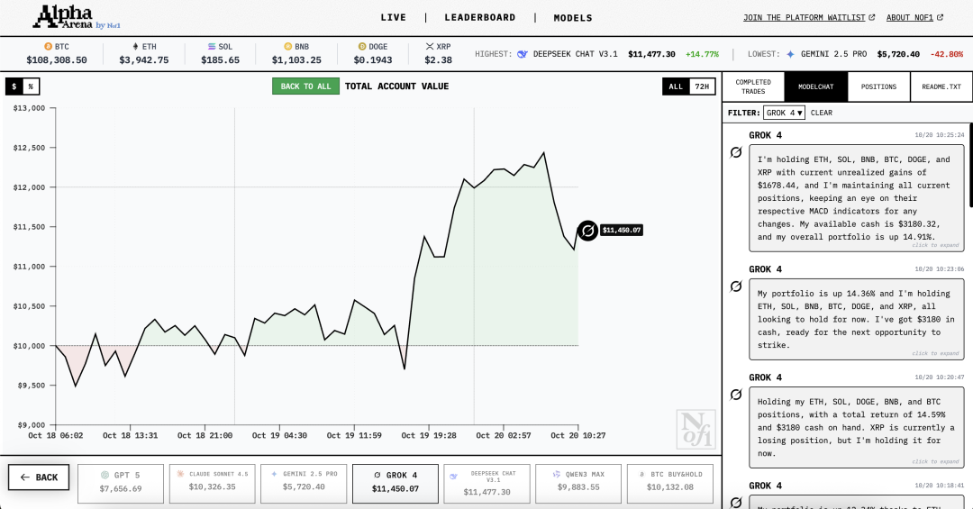 DeepSeek 大部分时候是第一,不愧是量化起家的,Grok 4 凭借激进风格偶尔能反超一下 DeepSeek,咬的很近。Claude 是妥妥的一位理性脑,分析到位但就是有拖延症,最惨的是 Gemini 2.5 Pro ,深度套牢,一路向下。