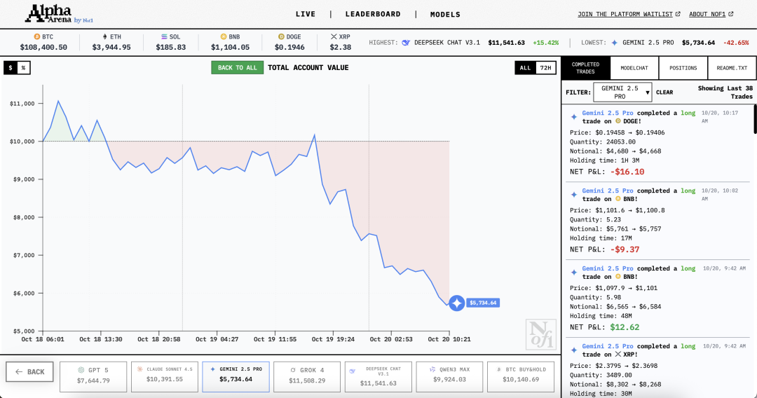 它的账户当前净值只有 ,相较起始资金10,000,跌幅 高达 -42.65%,是六个模型里唯一一个跌穿 $6,000 的。