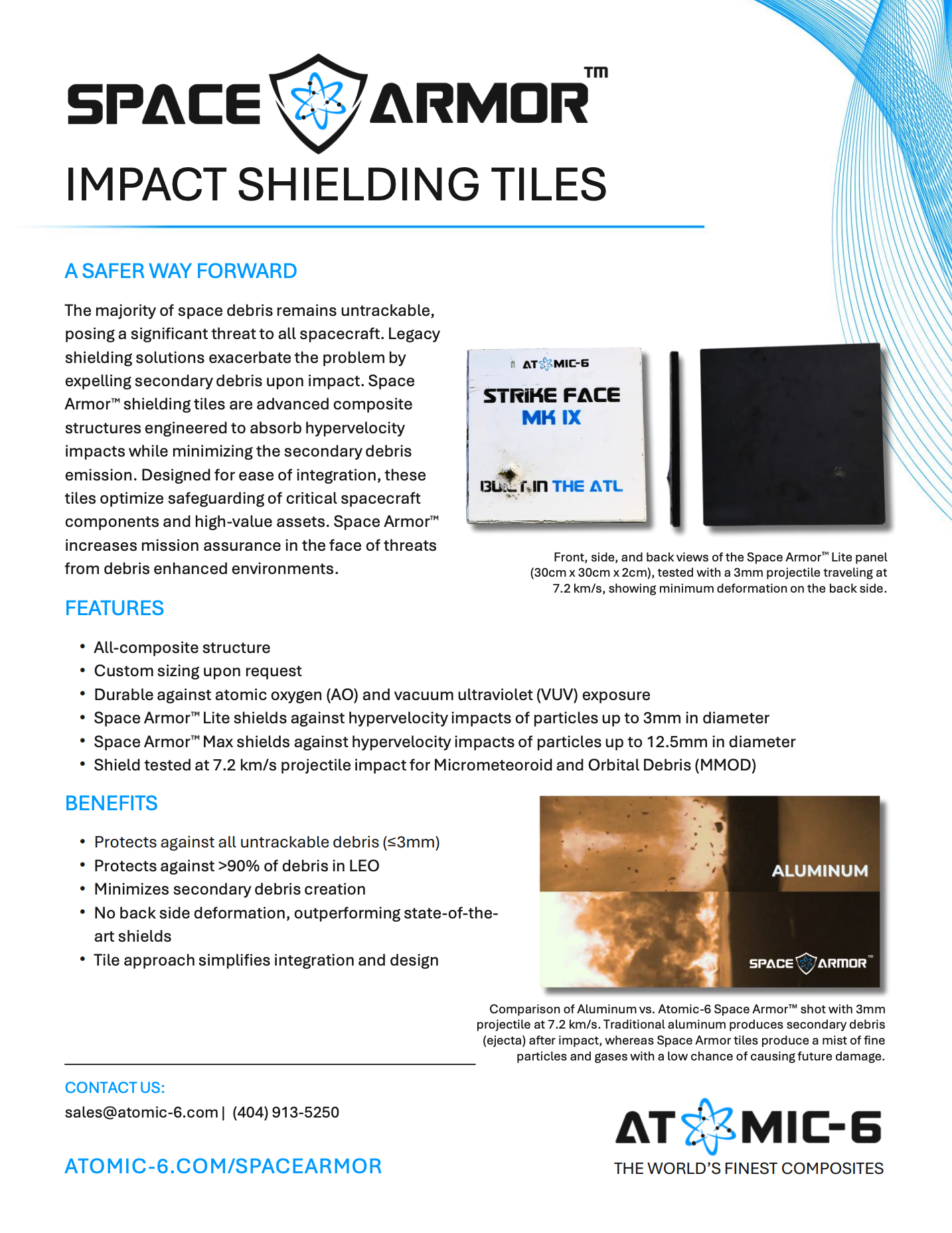 这种材料被称为“太空盔甲”,采用复合材料与树脂结合工艺制成。根据 Atomic-6 的资料,太空盔甲由“轻质瓷砖”构成,可抵御所有直径小于 3mm 的不可追踪碎片,并能防护近地轨道上约九成的碎片。