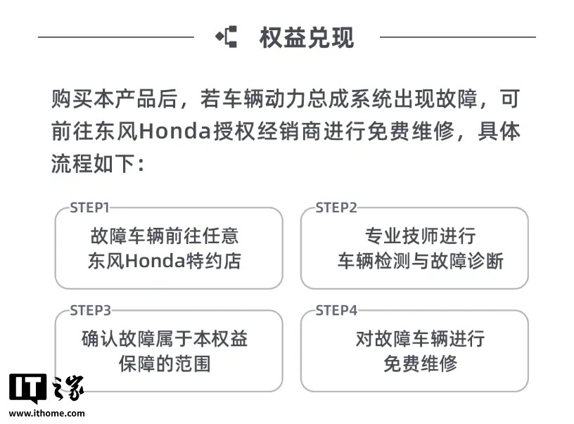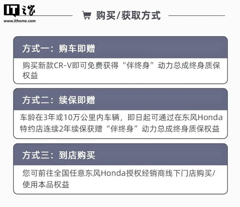 据IT之家了解,对于消费者而言,获取“伴终身”服务的途径较为灵活。除了购买新款本田 CR-V 的用户可以免费获赠该服务外,符合条件的用户还可以通过续保 2 年的方式获得,或者单独前往线下经销商门店进行购买。一旦持有“伴终身”产品,若车辆的动力总成部分出现故障,车主可以前往东风本田授权经销商进行预约,并享受免费维修服务。