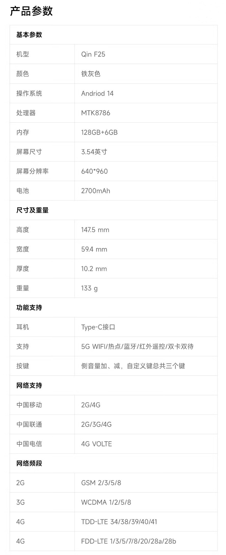 该机采用 10.2mm 厚度机身,重量 133g,配有 2700mAh 电池、Type-C 接口;搭载 3.54 英寸 640*960 分辨率触控屏,运行安卓 14 系统;还支持 5G Wi-Fi、蓝牙、红外遥控,以及 4G 移动网络。