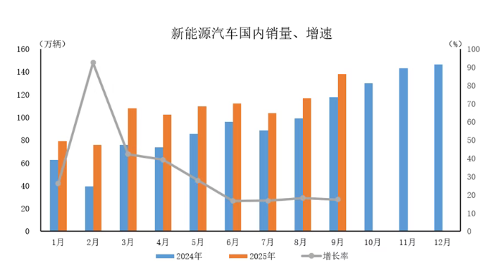 2025 年 9 月,新能源汽车国内销量 138.2 万辆,环比增长 18%,同比增长 17.5%。