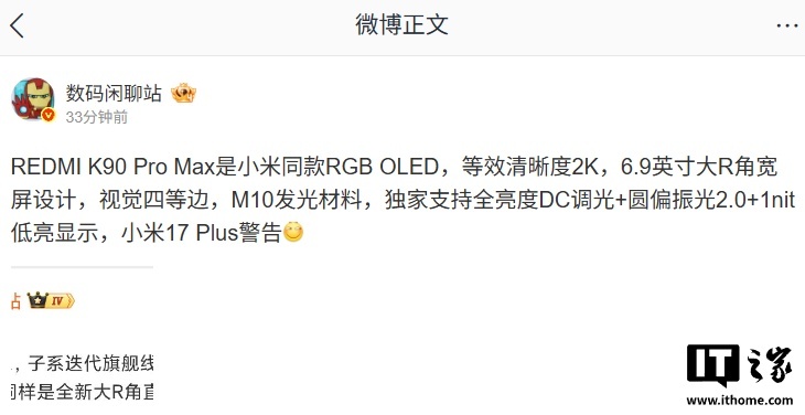 另据博主 @数码闲聊站 透露,REDMI K90 Pro Max 是小米同款 RGB OLED,等效清晰度 2K,6.9 英寸大 R 角宽屏设计,视觉四等边,M10 发光材料,独家支持全亮度 DC 调光 + 圆偏振光 2.0+1nit 低亮显示。