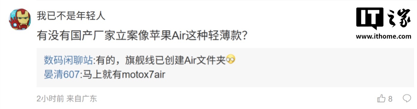 后续有用户评论区询问:“find 标准版什么时候才会补齐长焦微距 [大哭]”,博主回复道:“骂得狠就会补了 [二哈]”;另一名用户则询问道:“有没有国产厂家立案苹果 Air 这种轻薄款?”,博主则表示:“有的,旗舰线已创建 Air 文件夹”。