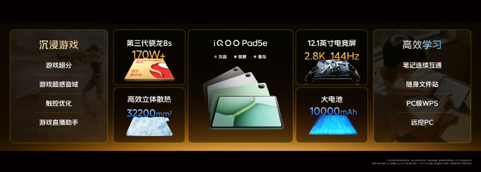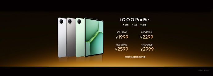 iQOO Pad5e平板发布:1999元起,第三代骁龙8s、12.1英寸2.8K电竞屏 凤凰网科技讯 10月20日,iQOO Pad5e平板发布,该平板采用第三代骁龙8s,搭配12.1英寸2.8K电竞屏、32200mm²高效立体散热,售价1999元起。 iQOO Pad5系列支持旗舰同款自研超分方案等多项游戏自研技术、iQOO 15同款游戏超感音域,新品还支持笔记连续互通、PC级WPS等。 价格方面,8GB+128GB版1999元;8GB+256GB版2299元;12GB+256GB版2599元;16GB+512GB版2999元。 Published by 风君子 独自遨游何稽首 揭天掀地慰生平 View all posts by 风君子