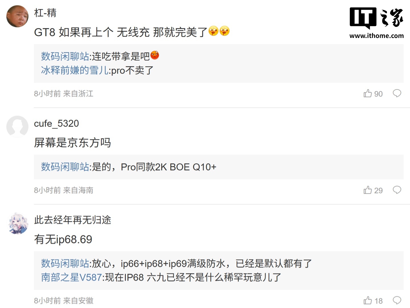 有用户在评论区询问新机的屏幕是否为京东方,博主透露“是的,Pro 同款 2K BOE Q10+”;还有用户询问真我 GT8 是否支持 IP68/69 防护,博主回复称“放心,IP66+IP68+IP69 满级防水,已经是默认都有了”。