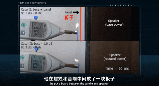 既然声音能穿透板子,但火焰效果却消失了,说明灭火的根本不是声音,而是音响振膜产生的风把蜡烛吹灭了。