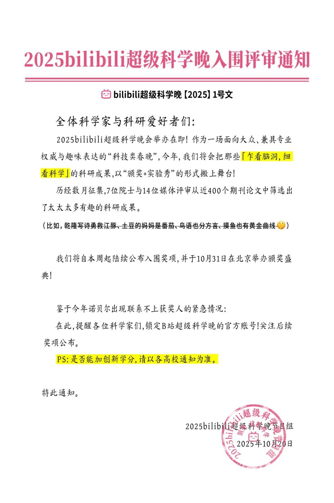 接下来两周,我们将陆续公布入围的脑洞课题,并将于10月31日19:00的2025bilibili超级科学晚,为这些大开脑洞的科学研究举办颁奖盛典。