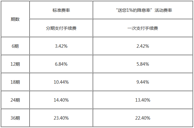 假如你借款1万元,选择的期数是12期,如果是分期支付手续费的话,那么12期的手续费=10000*6.84%=684元,如果是一次性支付手续费的话,那么12期的手续费=10000*5.84%=584元,就是节省了100元。