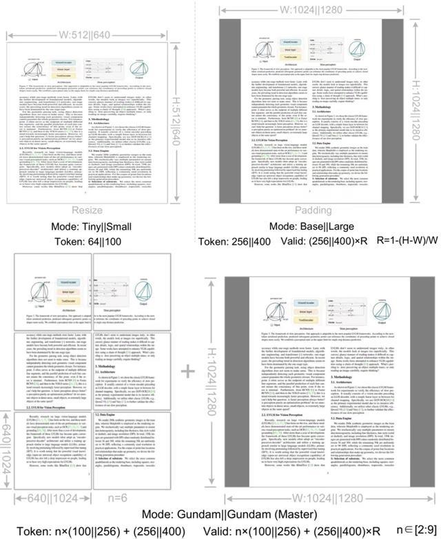 此外,它支持多种“分辨率模式”。从轻量的Tiny(64 token)到高保真的Gundam(795 token),模型可根据任务复杂度自动选择压缩等级。