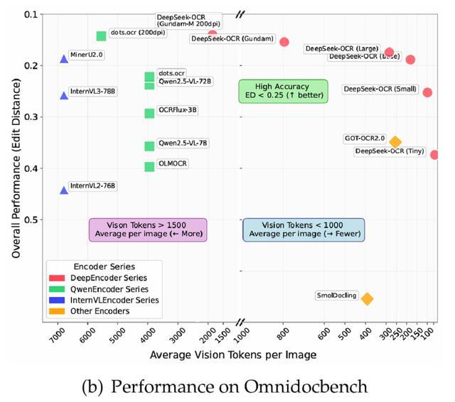 从行业视角看,DeepSeek-OCR展示了另一种提高模型效率的可能路径——优化信息表达方式。通过视觉压缩减少token数量,模型可以在相同算力下处理更长的上下文内容。这一思路为未来在VLM视觉token优化、上下文压缩机制以及大模型遗忘机制等方向的研究提供了有价值的参考。