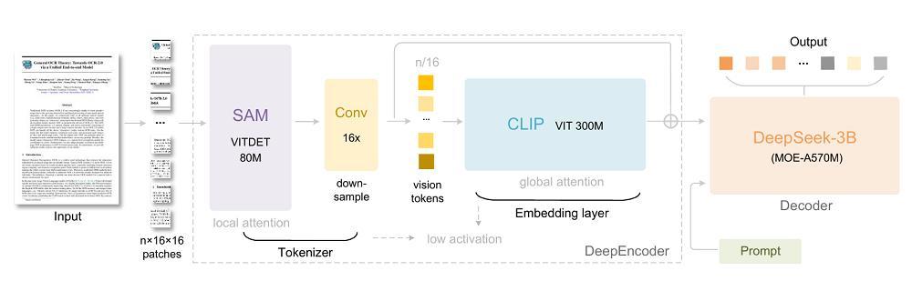 DeepEncoder采用SAM + CLIP的双结构设计,通过局部窗口注意力结合全局注意力实现高保真视觉理解,并用一个双层的16×卷积压缩模块显著减少vision token数量。