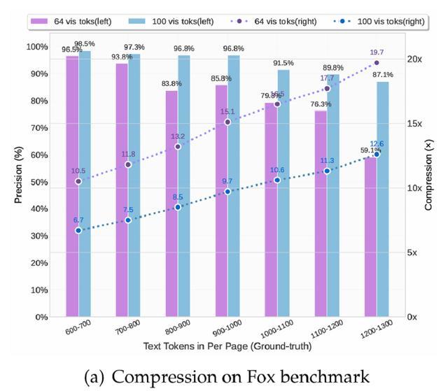 即便在近20×压缩时,模型仍能保持约60%的精度。这些结果充分说明,光学上下文压缩是一条前景广阔的研究方向,且无需额外计算开销,因为多模态系统本身已具备视觉编码器结构。