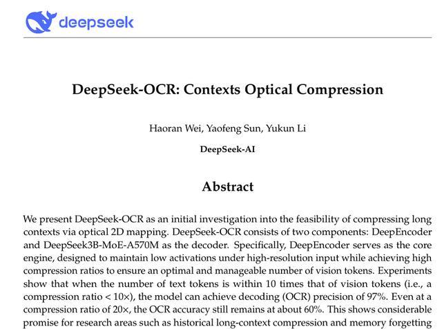 智东西10月20日报道,今天上午,DeepSeek开源了DeepSeek-OCR模型,首次提出了“上下文光学压缩(Contexts Optical Compression)”的概念,通过文本转图像实现信息的高效压缩。
