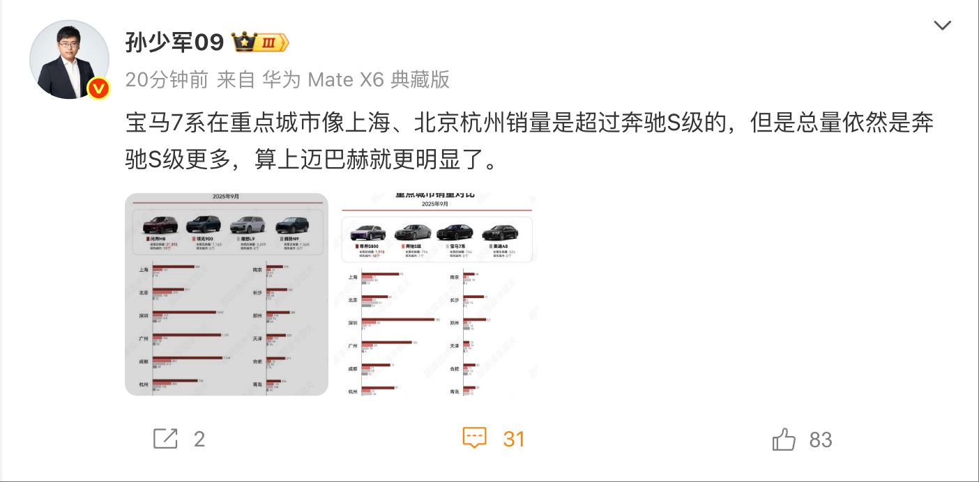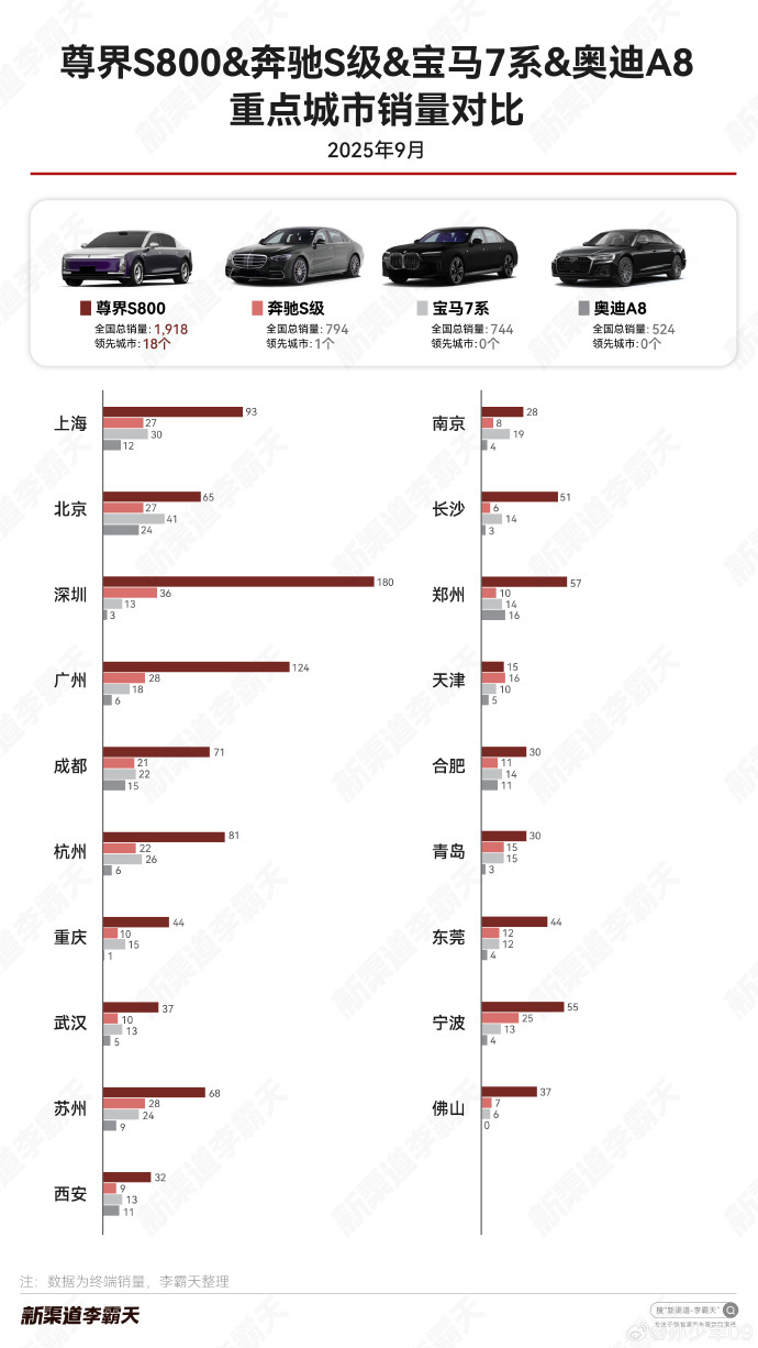 尊界S800重点城市9月销量对比:深圳180台居首 销量前5的城市均位于南方 凤凰网科技讯 10月21日,汽车博主“孙少军09”分享了一张尊界S800、奔驰s级、宝马7系、奥迪A8重点城市9月销量对比数据图。根据图中的信息,9月,尊界S800销量前五的城市分别是深圳(180) 、广州(124)、上海(93),杭州(81)、苏州(68),值得注意的是,北京销量为65台,排在第6位,销量前5的城市均位于南方。 该博主还称:“宝马7系在重点城市像上海、北京杭州销量是超过奔驰S级的,但是总量依然是奔驰S级更多。” Published by 风君子 独自遨游何稽首 揭天掀地慰生平 View all posts by 风君子
