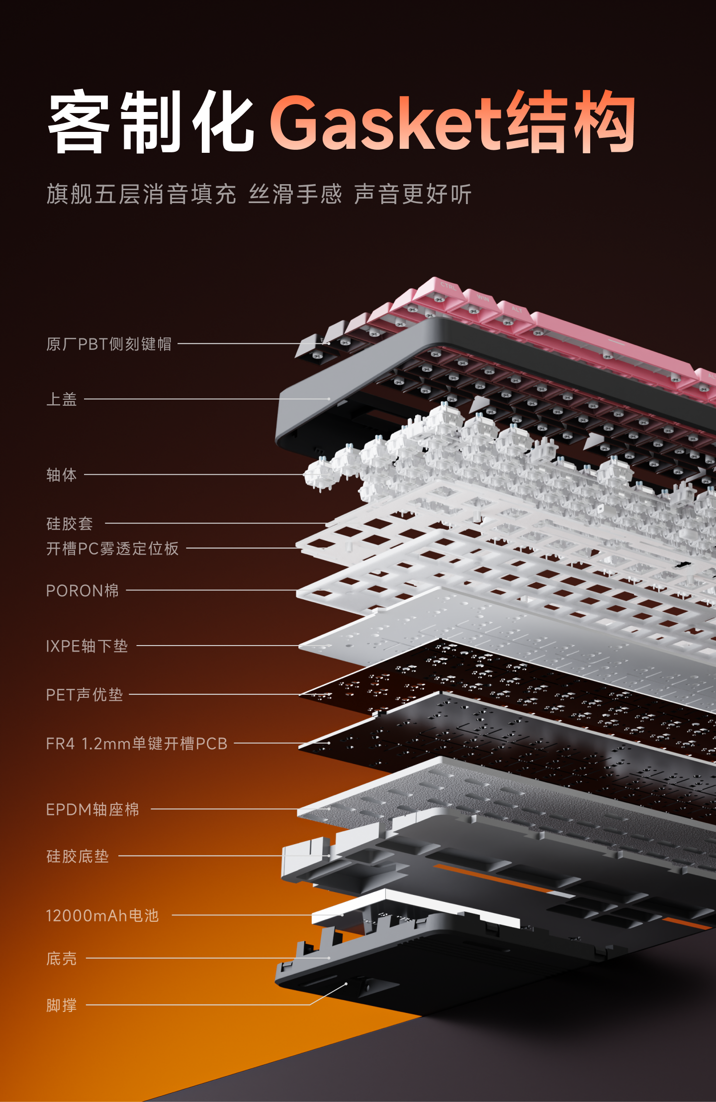 前行者 X87S 采用 19.5mm 低前高设计,方向键区上方包含一条 ARGB 流光灯带。其采用 Gasket 垫片固定结构,配备 PC 雾透开槽 PC 定位板和 FR4 材质 1.2mm 单键开槽 PCB,拥有五层消音填充材质