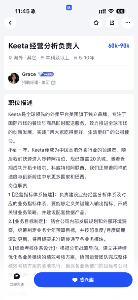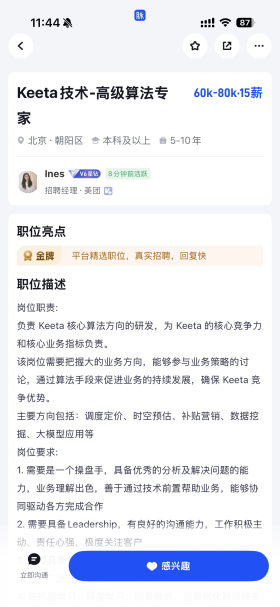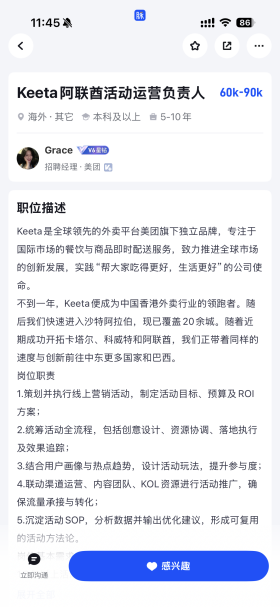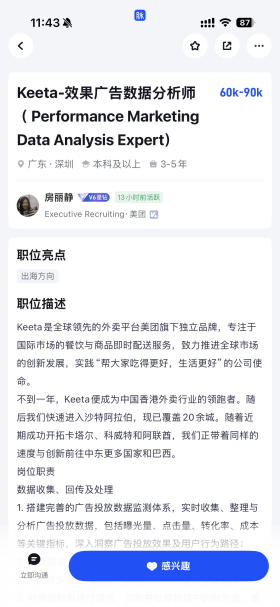 与此同时,美团旗下海外品牌Keeta正大力扩充团队,在职场社交平台脉脉上释放多个高薪职位。招聘信息显示,岗位包括月薪最高达9万元的数据分析师、阿联酋活动运营负责人,以及年薪120万元的高级算法专家等。相关人力资源负责人亦保持高频更新,持续吸引人才加入。