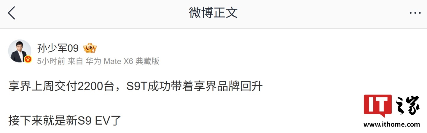 IT之家 10 月 21 日消息,博主 @孙少军09 今日发文透露,鸿蒙智行五界之一的享界汽车上周交付 2200 台,享界 S9T 新车成功带着享界品牌回升。博主透露,享界后续将带来新 S9 EV 新车。
