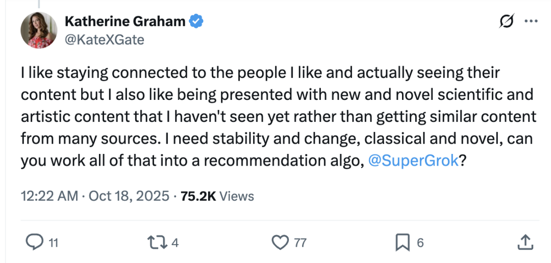 而像Grok这样的AI,则可以逐条阅读帖子和视频,根据每个人的兴趣进行个性化推送,让更多小号内容被公平发现。