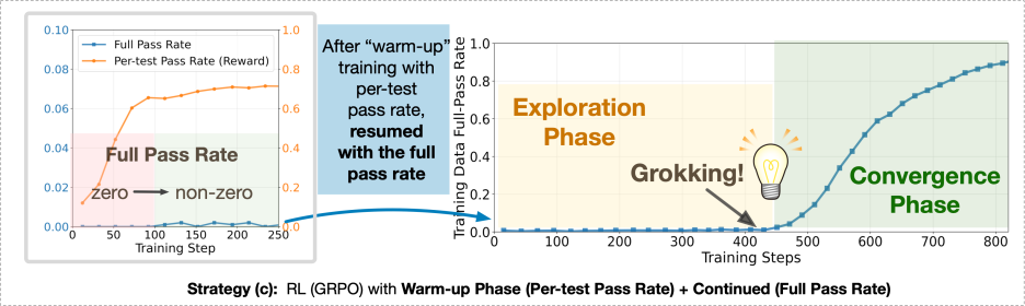 研究者发现,关键在于时机的切换。当模型通过密集奖励阶段获得「半正确」策略后,再切换到「全对才算赢」的二值奖励,模型突然迎来那一刻——Grokking Phase Transition:从模糊到精确的飞跃。