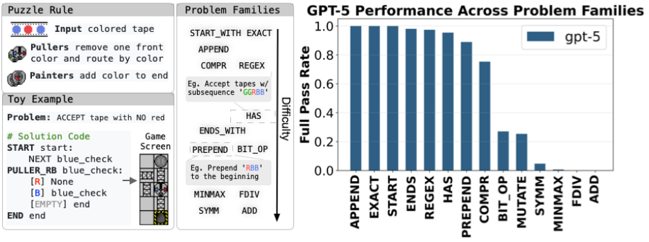 研究者不是简单复刻原始的谜题,而是合成了一批全新问题族。这些问题族的难度有简单有困难,最难的问题使得GPT-5都只有0的正确率。