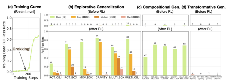 这表明,RL 学习到的技能具备有限的迁移能力:它能重组技能,但尚未形成「概念跃迁」的能力。