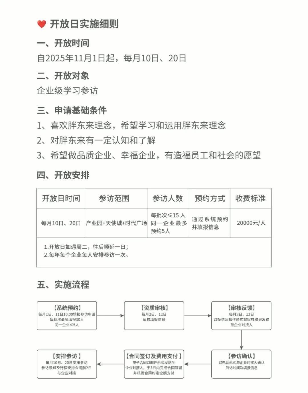 参访对象需具备对胖东来理念的认同,并有意打造品质企业与幸福企业。每批次参访人数不超过 15 人,同一企业最多预约 5 人,费用为每人 20000 元。