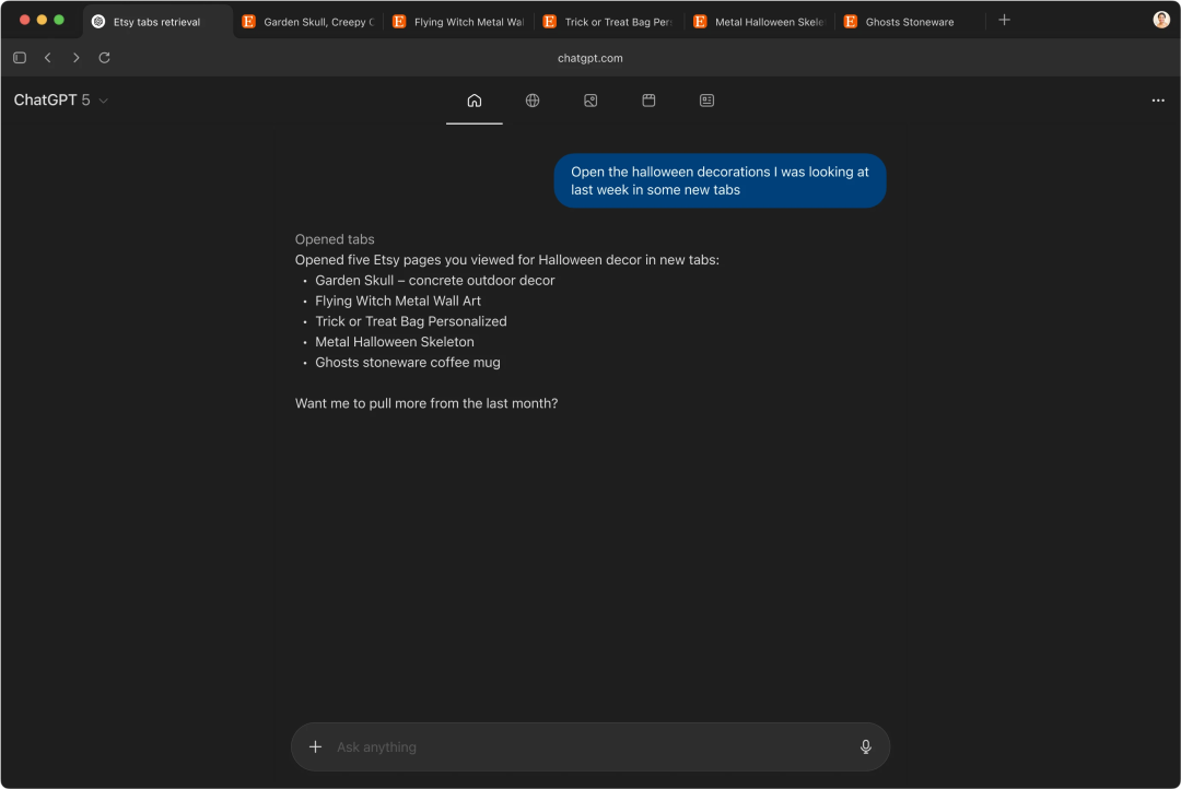 ChatGPT能记住你探索过的内容,并为你建议下一步行动,无论是返回最近访问的页面、深入研究某个主题、发现相关灵感,还是将日常任务自动化。