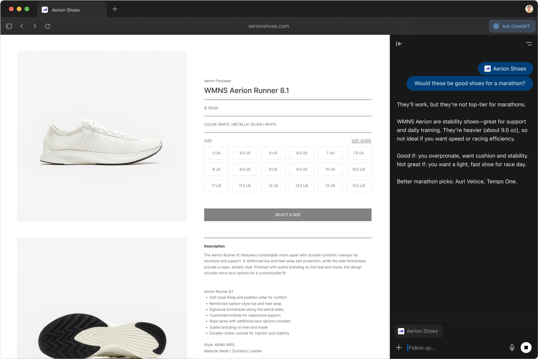 输入「重新打开我昨天看过的那些鞋子」或「整理一下标签页」,剩下的就放心交给ChatGPT吧。