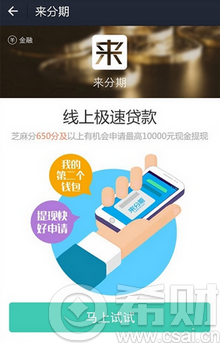 支付宝来分期是支付宝通趣分期公司合作推出的一项互联网金融贷款业务,申请的要求是芝麻分在650及其以上,而此前的借呗申请要求是芝麻分只需600分及以上。好期贷申请要求是信用分最低要700分,门槛还是比较高的。