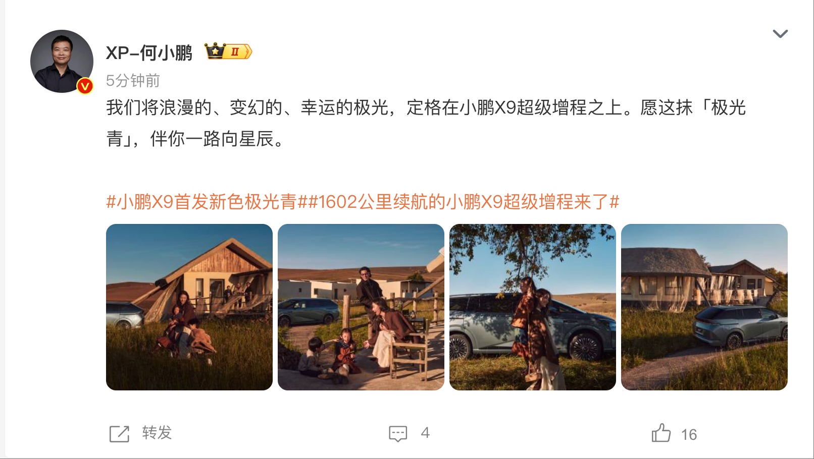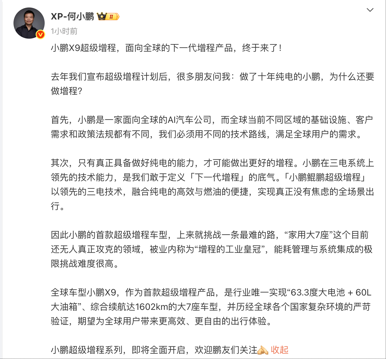 小鹏X9超级增程官宣:首发新色极光青、综合续航1602km 凤凰网科技讯 10月23日,小鹏汽车董事长何小鹏发文宣布,小鹏X9超级增程首发新色极光青。 稍早前,何小鹏发文称,小鹏X9超级增程,面向全球的下一代增程产品,终于来了。 文中何小鹏回答了为什么要做增程?他表示,一是必须用不同的技术路线,满足全球用户的需求。二是只有真正具备做好纯电的能力,才可能做出更好的增程。 据何小鹏介绍,小鹏X9超级增程是行业唯一实现“63.3度大电池+60L大油箱”、综合续航达1602km的大7座车型。 Published by 风君子 独自遨游何稽首 揭天掀地慰生平 View all posts by 风君子