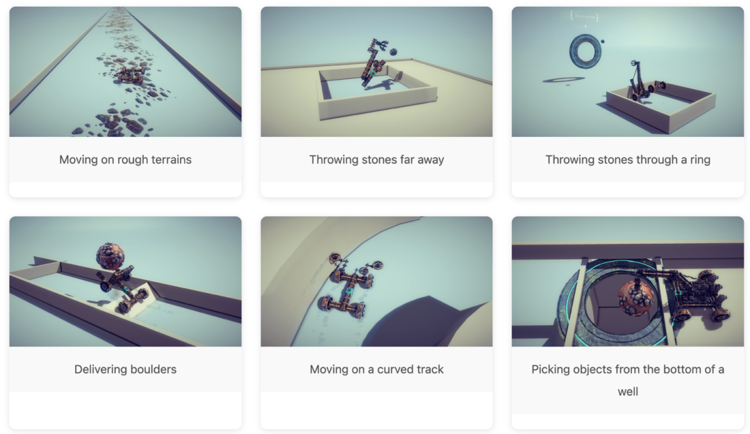 平台还设计了一系列从易到难的任务,比如直线行驶、投掷、抓取,甚至还有过障碍、地形坡度、穿环投掷等更复杂的场景,构成了一个多样化的实验空间。