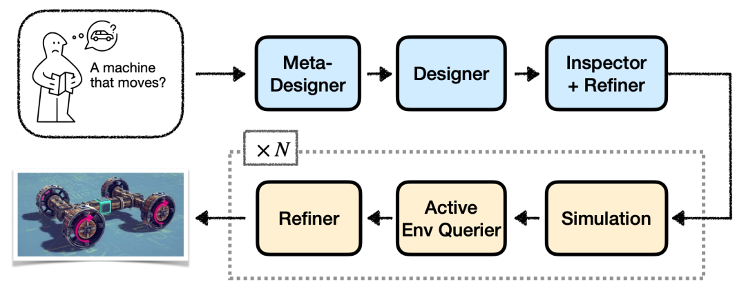 谁成想,它真的开始动手造了,在一个真实的物理仿真世界里,一边搭零件,一边看效果,一边修改。