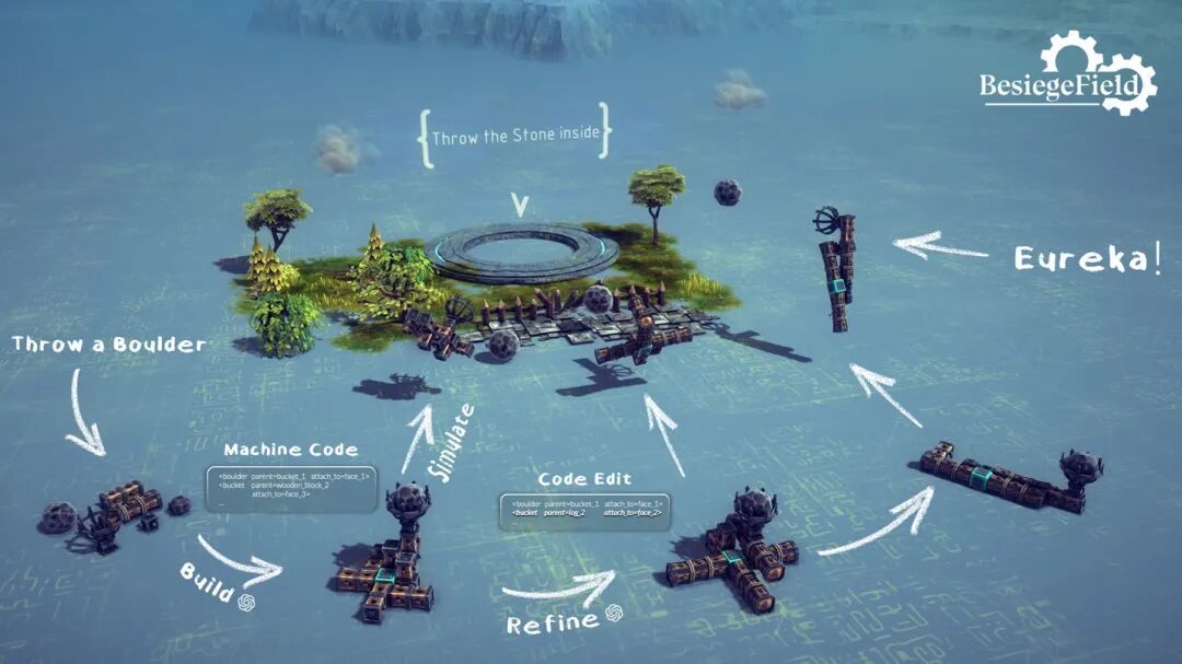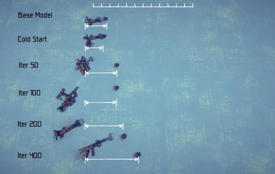 BesiegeField的仿真反馈就是现成的“奖励信号”(Reward):比如投掷距离多远?能不能成功执行任务?能运行多久?