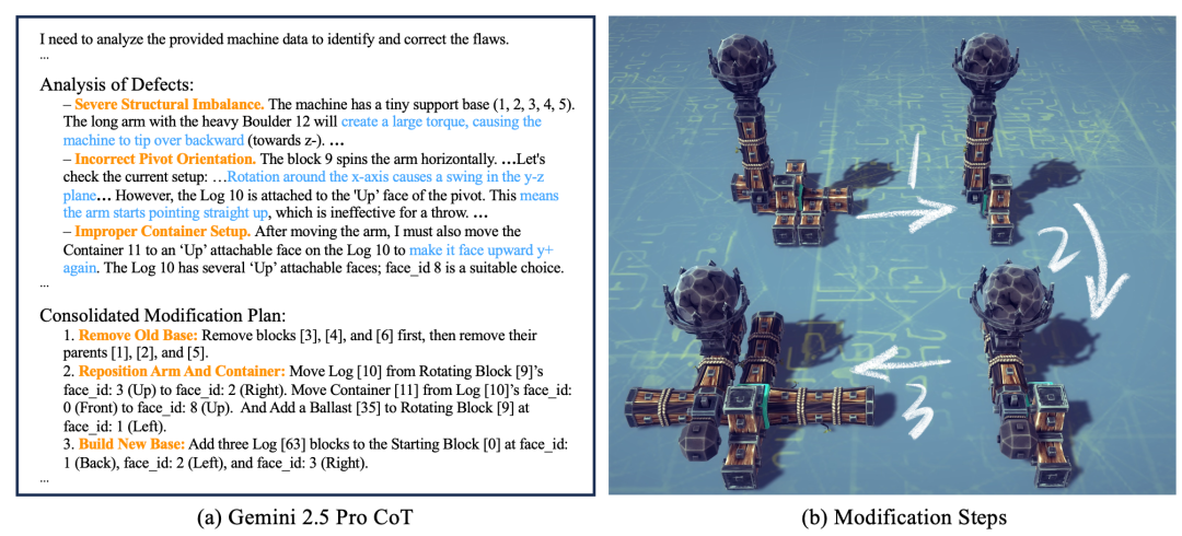 比如在优化投石机时,Gemini 2.5 Pro能根据仿真反馈,识别出“底座太小导致结构失衡”、“旋转轴方向错误导致无法发力”等问题,并提出“移除旧底座”、“重新定位手臂和容器”、“构建新底座”等修改方案。