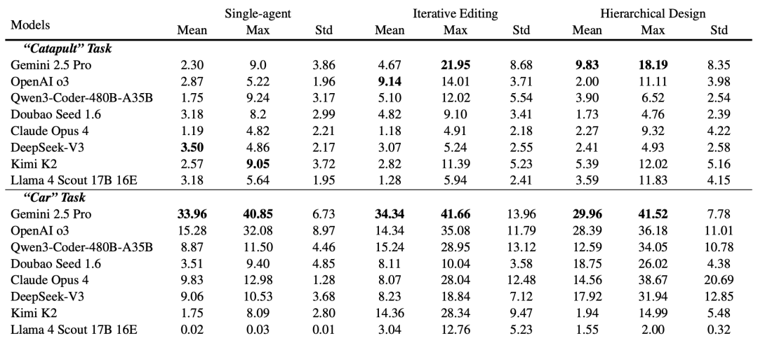 对比表格显示,这套“多角色分层设计”(Hierarchical Design)策略,在投石机(Catapult)和小车(Car)任务上,其平均分(Mean)和最高分(Max)都显著优于以Gemini为代表的部分“单一模型”或简单的“迭代修改”策略。