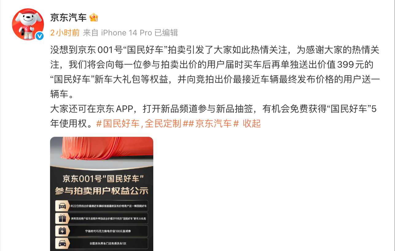 今日,京东汽车官方发布消息称:没想到京东001号“国民好车”拍卖引发了大家如此热情关注,为感谢大家的热情关注,我们将会向每一位参与拍卖出价的用户届时买车后再单独送出价值399元的“国民好车”新车大礼包等权益;
