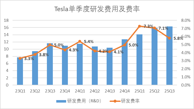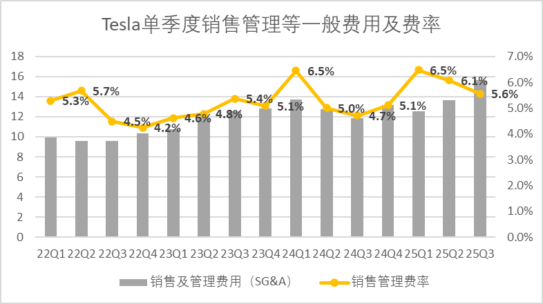 从费率也可以看出,三季度特斯拉的研发费用和销售管理费用分别录得16.3及15.6亿美元,均创单季度新高。但结合营收来看,整体的费率分别只有5.8%及5.6%,并不算高,并且销售费用端还有一笔2.4亿美元的重组一次性支出。