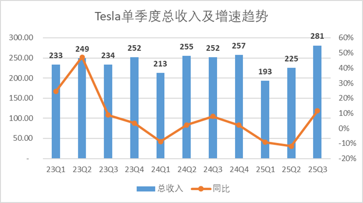 美东时间10月22日美股盘后,特斯拉公布了2025年第三季度的财务报告,录得总营收280.95亿美元,明显高于分析师预期的264亿美元;营运利润16.24亿美元,也略高于分析师预测15.8亿美元;Non-Gaap下EPS录得0.5美元,略低于分析师预测0.55美元。