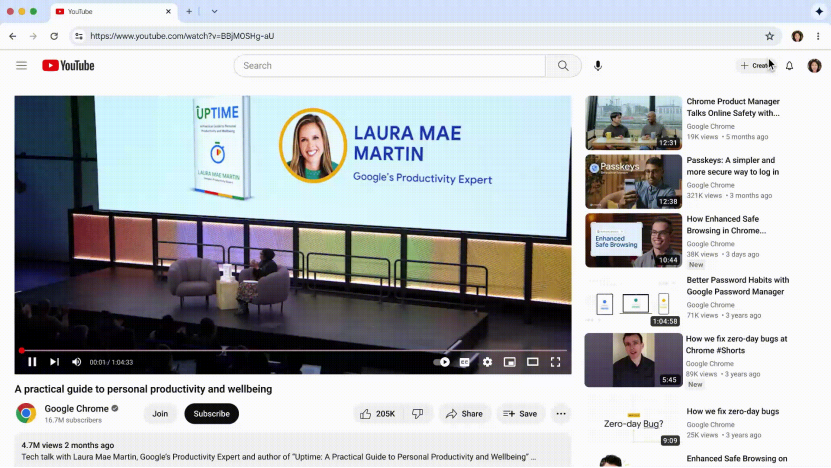 正巧,一个多月前的Chrome也演示了同类功能。用户看着YouTube视频,点击Gemini星标问一句“总结这个视频”,AI立马给出大纲总结和要点对应的视频时间戳。