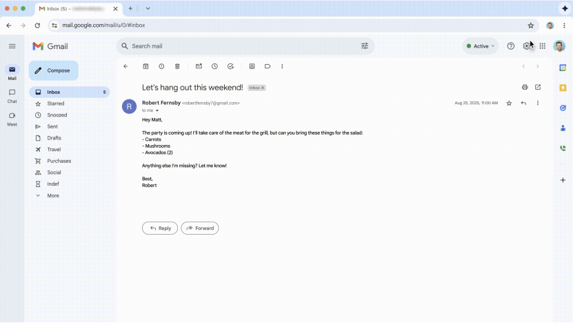 Chrome在一个多月前也更新了同类功能,示例是用户在侧边栏输入一句之后,AI智能体读了电邮中的菜谱,按菜谱自动在网店里点齐菜品放进网络购物车。除了最初的一句指令和最后的确认支付,用户本人完全不用插手AI智能体的工作流程。