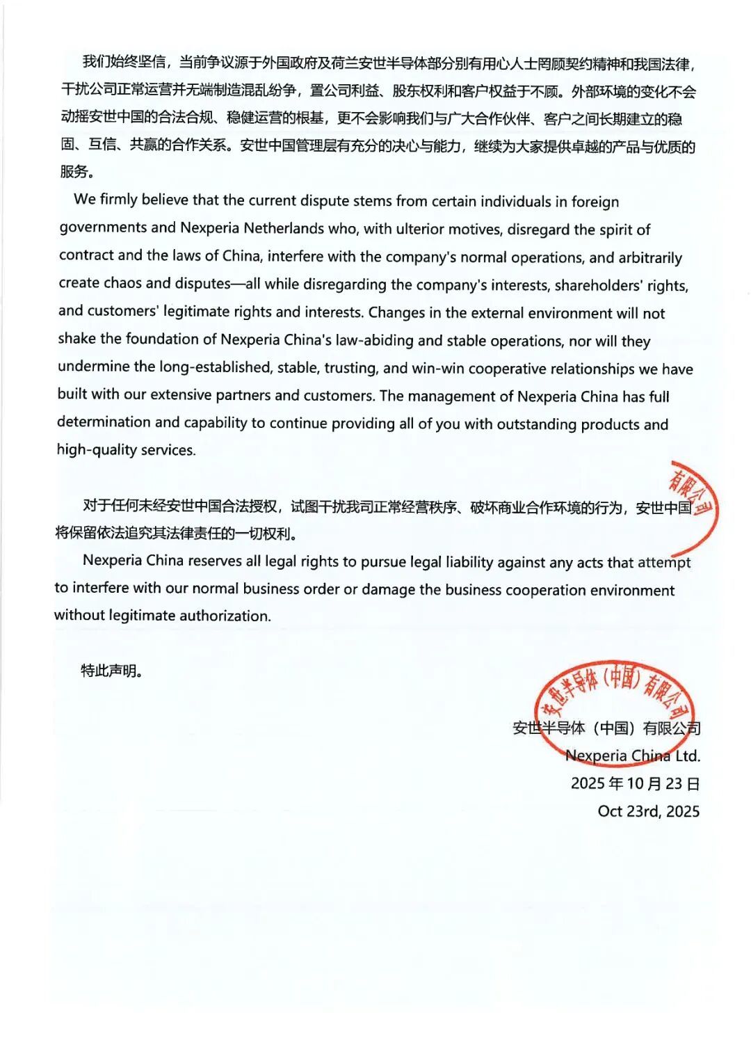安世中国:荷兰总部免职决定在中国境内无法律效力 凤凰网科技讯 10月23日,安世半导体中国有限公司公众号消息,安世半导体(中国)有限公司现就近期荷兰总部单方面免去张秋明先生销售市场部副总裁职务一事,发表如下正式声明: 一、荷兰总部相关决定在中国境内不具备法律效力; 二、张秋明职务身份保持不变; 三、张秋明先生职权范围内的行为代表安世中国; 四、安世中国业务运营一切正常,目前,安世中国所有业务活动、生产运营及对外合作均在法律与管理制度框架下有序、正常开展,不受任何外部单方面决定的影响。我们完全有能力确保业务的连续性与稳定性。 Published by 风君子 独自遨游何稽首 揭天掀地慰生平 View all posts by 风君子