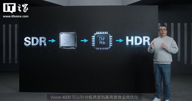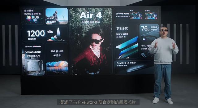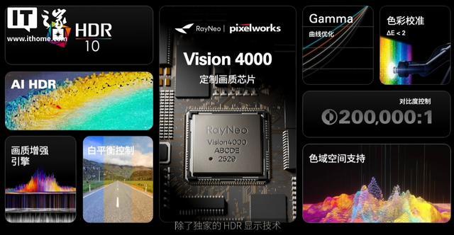 据介绍,这款产品是全球首款 HDR 观影眼镜,支持 AI 动态 HDR 显示,峰值亮度达到 1200nits,第一次实现了 SDR 转 HDR 的能力。这得益于新品搭载全球首颗眼镜画质芯片 Vision 4000,可以针对低亮度到高亮度做全局优化。