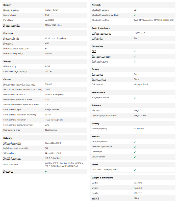 尺寸方面,IT之家援引博文介绍,荣耀 Magic8 Lite 的机身尺寸为 161.9 x 76.1 x 7.76 毫米,重量为 189 克,设计上与部分市场已上市的荣耀 X9d 几乎一致。