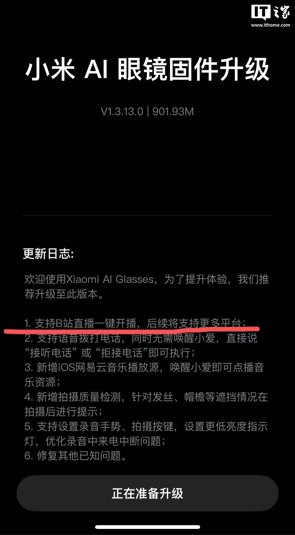 IT之家 10 月 24 日消息,小米 AI 眼镜现已迎来 1.3.13.0 固件更新,新增B站直播一键开播、拍摄质量检测等功能,并优化各种已知问题。
