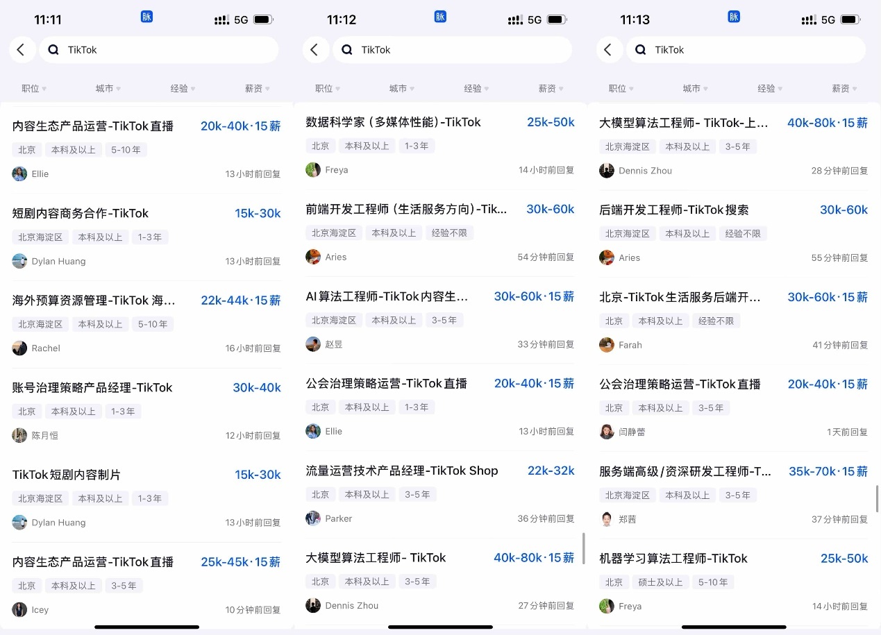 凤凰网科技讯 10月24日,日前TikTok架构再调整,1992年出生的支颖成为TikTok总负责人。随着架构调整,TikTok也加快招聘中高端人才的步伐,多位HR在求职招聘平台脉脉上保持分钟级活跃,回复候选人信息。