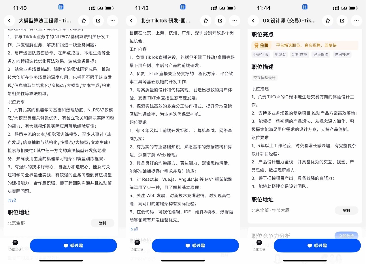 目前,TikTok在脉脉上发布了多个百万年薪岗位,工作地址包括国内的北京、上海、深圳、杭州等城市以及欧美、东南亚等多个地区,岗位类型涵盖业务规划、产品经理、数据科学、设计师、算法、前端后端等多个工种,其中数据科学、大模型算法等多个岗位年薪超过120万。