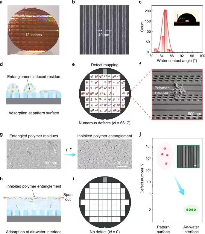 深入理解现象背后的成因是解决问题的关键。团队通过计算机模拟(分子动力学模拟)验证了实验结果,并揭示了分子聚集和缠结的能量驱动机制及可逆特性。基于这些深刻洞察,研究团队提出了两项既简单又高效、且能与现有芯片生产线无缝兼容的创新解决方案:一是通过适当提高显影前的烘烤温度,利用缠结的热敏感性,有效促使大团聚体解离成更小、更分散的分子链;二是在显影过程中优化工艺,确保晶圆表面始终覆盖一层连续的液体薄膜,这层薄膜就像一张高效的“捕网”,能捕获并将吸附在界面上的分子团簇冲刷带走,阻止其回落污染电路图案。