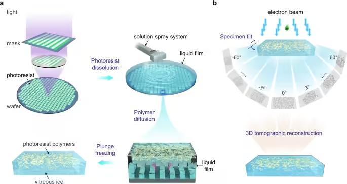 这项突破性研究由北京大学化学与分子工程学院彭海琳教授、高毅勤教授、郑黎明博士联合清华大学王宏伟教授、香港大学刘楠博士等共同完成。研究团队创造性地将原本主要用于生命科学研究的冷冻电子断层扫描(cryo-ET)技术,首次引入半导体制造领域。这项技术的精妙之处在于,它能以极快的速度(超过每秒一万摄氏度)将显影液连同其中的光刻胶分子瞬间冻结在它们的“工作状态”,如同按下时间的暂停键,完整保留了这些分子在液态环境中的真实构象。随后,利用先进的成像和三维重建技术,科学家们成功获得了分辨率优于 5 纳米的光刻胶微观三维“高清全景图”,首次在原位状态下清晰地揭示了光刻胶分子在显影液中的三维结构、界面分布以及相互缠绕(缠结)的行为细节。