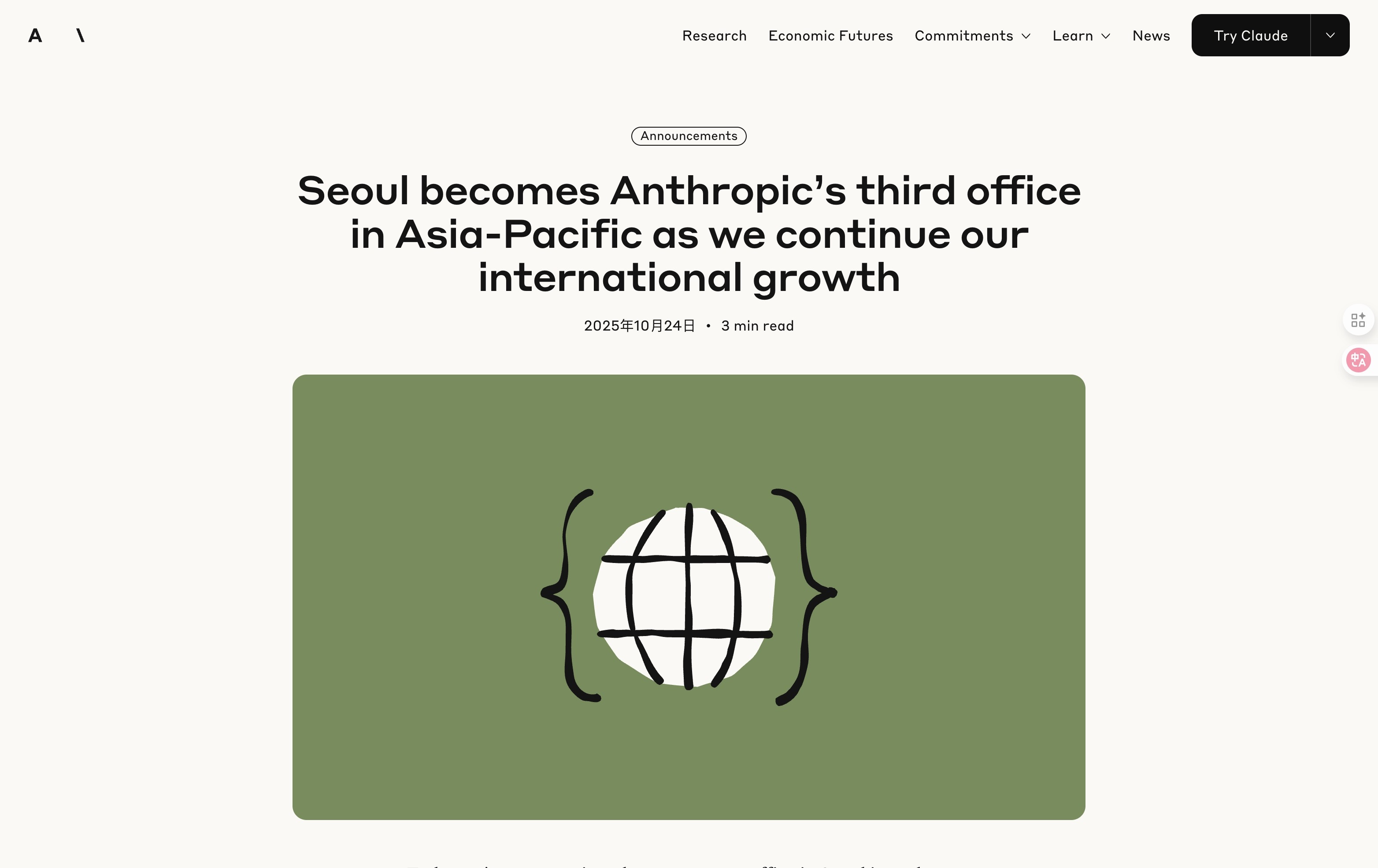 Anthropic 昨日在官网发布新闻稿,宣布将在 2026 年初于首尔设立办公室,这是继东京和班加罗尔之后,Anthropic 在亚太地区的第三个办公室。